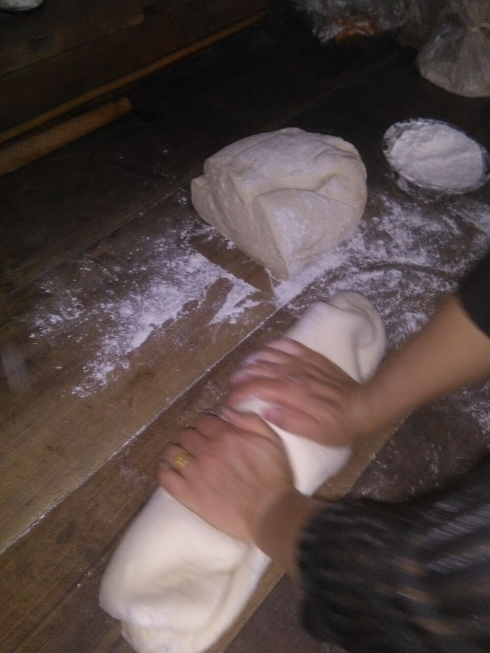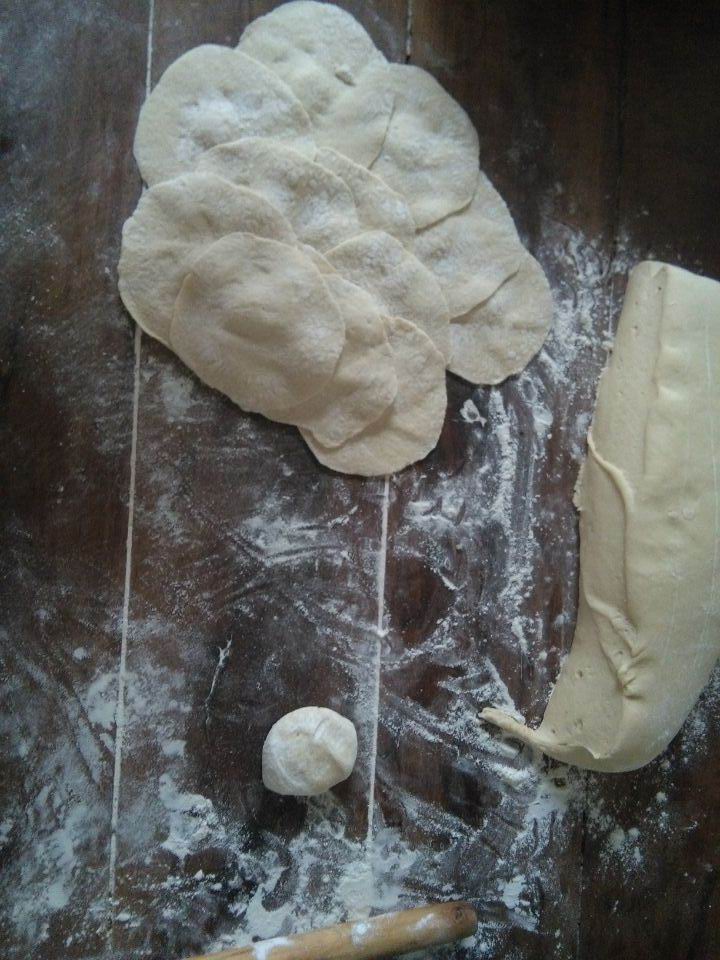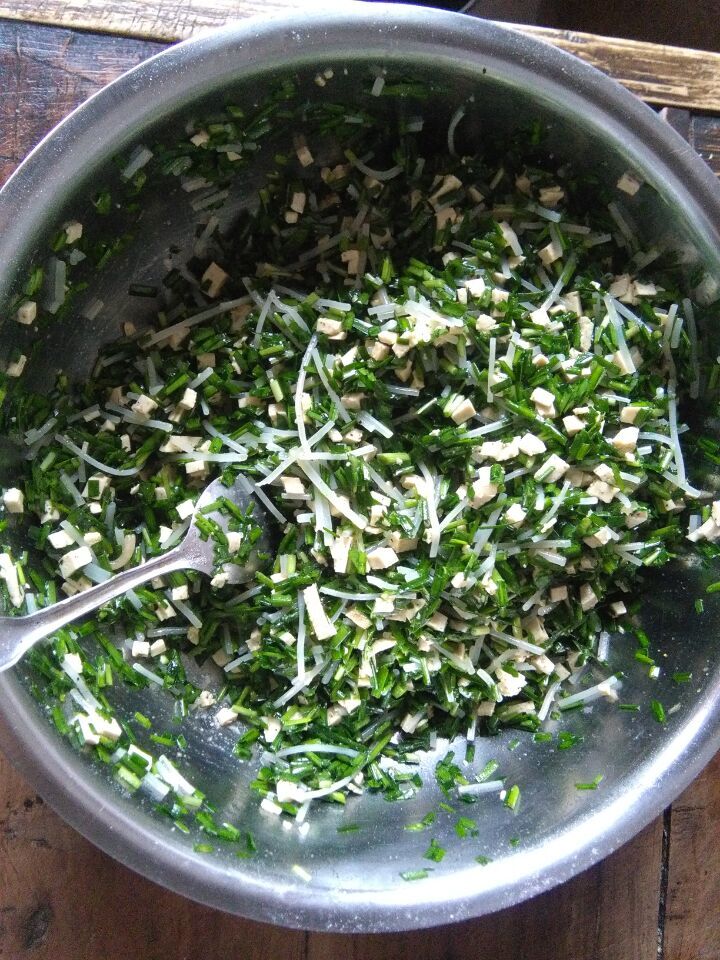 割完韭菜,我和妈妈便回到了家,开始着手准备韭菜饼的馅料。所谓韭菜饼,顾名思义,就是以韭菜为原材料,再配上其他辅料烙制而成的饼,韭菜饼的配料百搭,几乎什么都能做他的辅料,常见的有豆腐,鸡蛋,火腿等等。这次妈妈用的配料是火腿,将韭菜洗净切好,拌入火腿,放上调料,搅拌均匀,就搁置在桌边备用。制好馅料,妈妈就开始擀面皮,擀的面皮和包包子的一样,都是中间厚边缘薄的圆面皮。