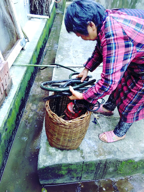 在过了不久后,婆婆说是抽水机快要没被水淹了,要去把抽水机放下去一些,就叫我来灌菜。