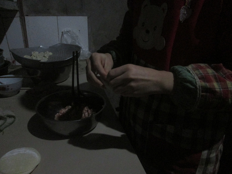 准备工作就准备好了。下面我和饺子的大战就开始了;我左手托着面皮,右手拿着筷子往里面挑饺子馅,把饺子馅挑在面皮上后;左手拿着还未成型的饺子,右手就依次从左往右捏成花边,捏到右边就算完成一个了。