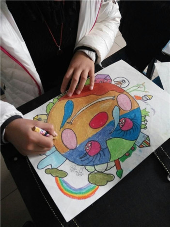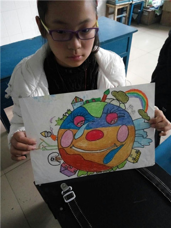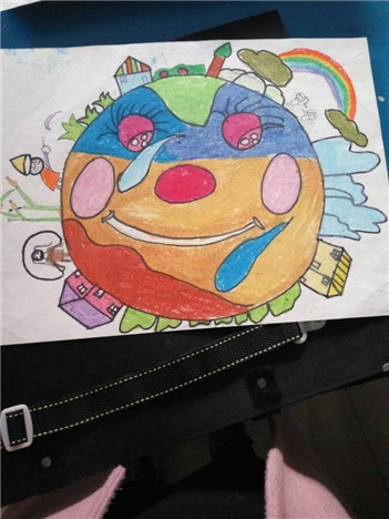 地球是我画的,他是一个笑脸地球。地球上有草垛、山、房子、彩虹……地球是我的母亲的眼睛像个圆球。