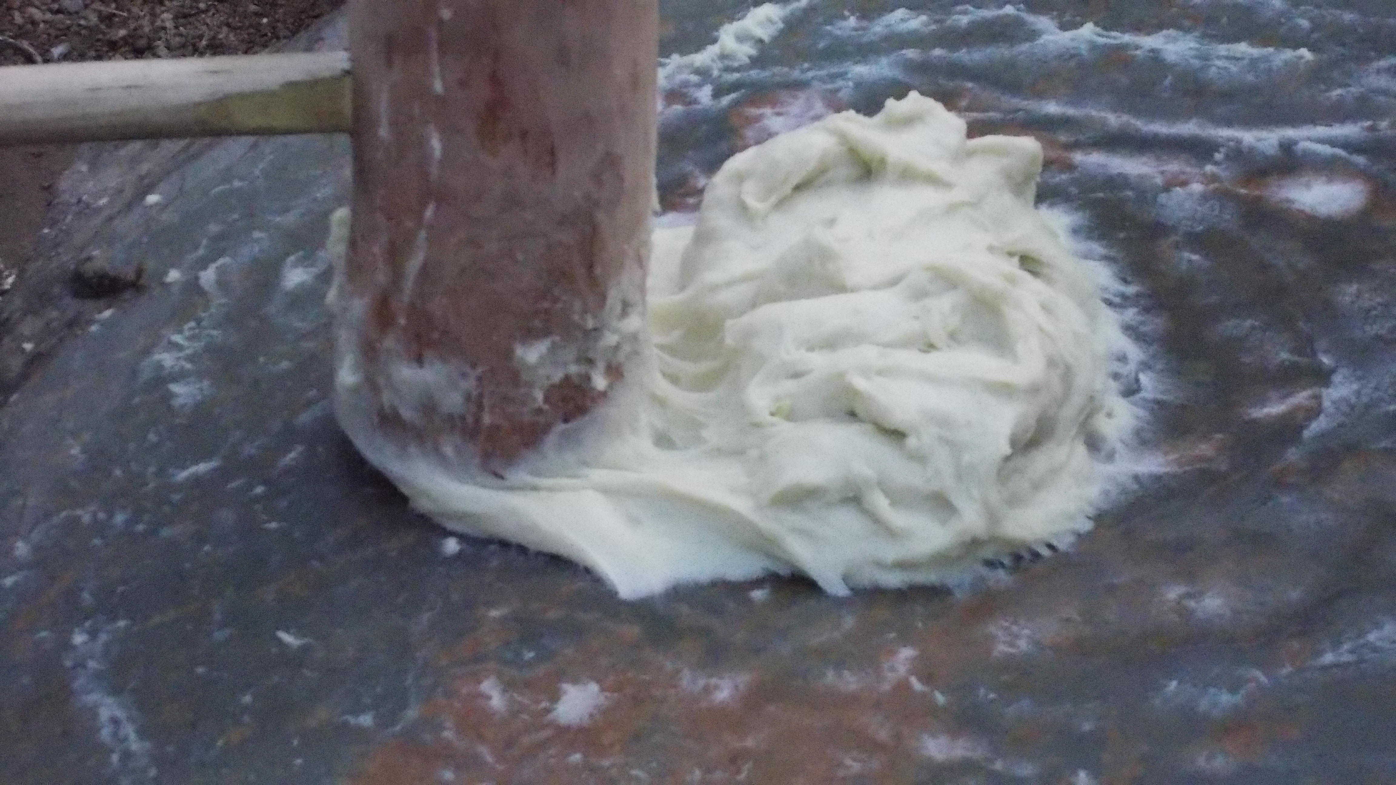 然后要用木锤反复的压挤,这途中要注意,千万不能使大劲,因为这样可能会把洋芋打到地上。只有打到快成团时,才可以使大劲。