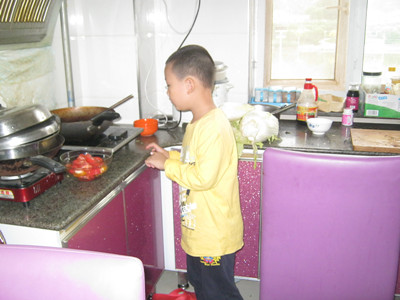 做点什么好呢?对了,就做我平时最喜欢吃的“西红柿炒鸡蛋”。我先按照原来的方法焖好米饭,一切顺利。该炒菜了,我先拿出西红柿、鸡蛋、葱花等食材,将西红柿洗净,切块,将鸡蛋打到碗里,葱花备用。然后,开火倒油,油温后,倒入鸡蛋,翻炒两分钟左右盛到碗里。接着再倒入一次油,放入葱花和西红柿,两分钟后加入鸡蛋,这一刹那,我烧的水开了,去拔电源并将烧开的水倒入杯中,回到厨房,闻到了一股糊味,打开锅盖,西红柿几乎被熬成了汤,鸡蛋也很硬,盛出来后,尝了一口,除了糊味之外,还觉得缺了点什么。“对了,食盐!”我惊叫道。这盘既糊又忘记放盐的菜,以彻底失败告终。