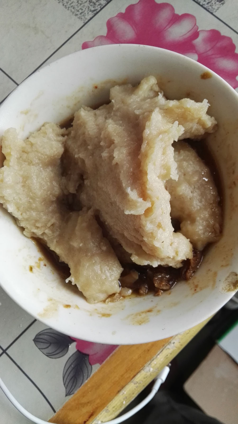 蒸好的磨擦擦蘸上炖好的肉汤吃,又劲道,又香。如果你没有吃过,欢迎来我的家乡来品尝。