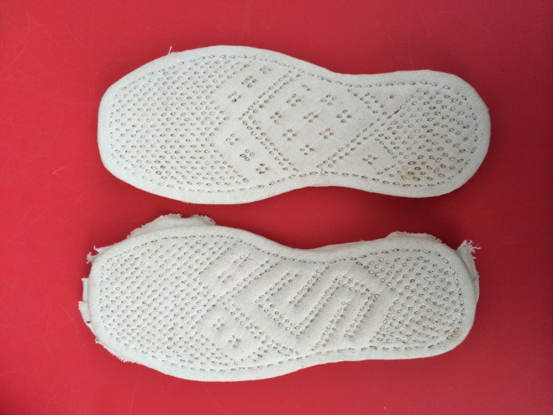 拉好鞋底就开始做鞋邦,把刚开始干好的布依照画好的鞋邦剪下,然后添布,最后在布上贴上一层新布,鞋邦就做好了。之后,把鞋帮和鞋底用麻绳依照做鞋底的方法拉起来一双布鞋就做好了。