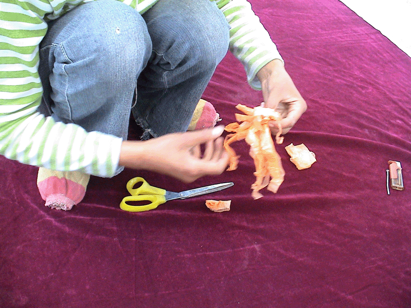2. 把折叠好的塑料,剪成细条,从开端剪,剪的时候,不能全部都剪下来,只是把折叠的部分剪下来,每个细条的宽度要均匀。把剪好的那部分拆散开,把没剪的部分依次折叠。