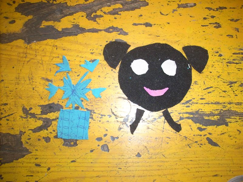 我想做一枚大熊猫吃竹叶图样的书签,于是,我找来一些五颜六色的随布片。首先选一块小黑布剪出一个大熊猫的鸭蛋形脑袋,接着又剪了两片半圆的小耳朵,再用白色的布剪了一双圆溜溜的眼睛,又用红布剪了一个月牙形的嘴巴。至此,熊猫头作成了。