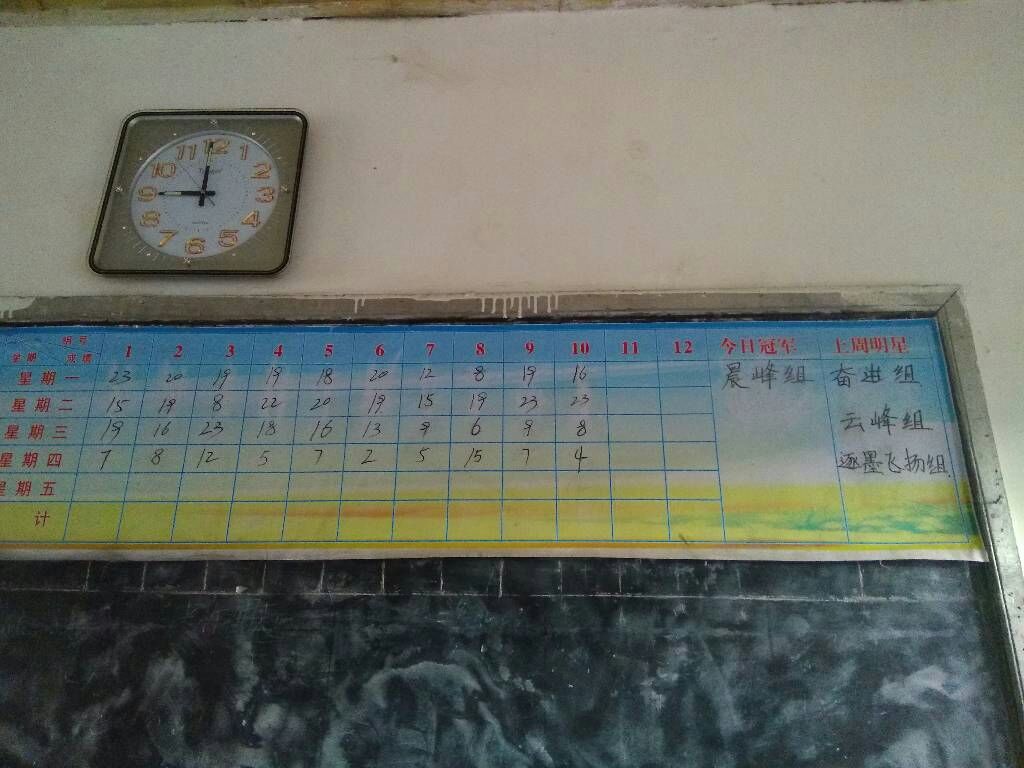 教室的后墙上挂着一口大钟,提醒我们珍惜时间,勤奋努力。大钟下面是我们的评价表,上周明星,今日冠军组一目了然。评价表反映着我们的点滴进步,记录着我们每个人的成长,也融合了我们的欢笑,我们的烦恼。