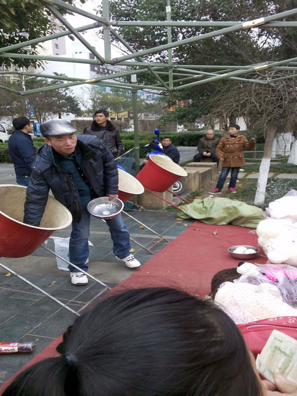 因为我们几个喜欢凑热闹,所以又在这里停下了脚步;这里是一个40几的人,在他的旁边有几个木桶,和一些玩具,木桶是用来投东西的,如果投上了,你可以在这里选择一个玩具带走;我们便开心的投了起来,可是一个也没有扔进去......