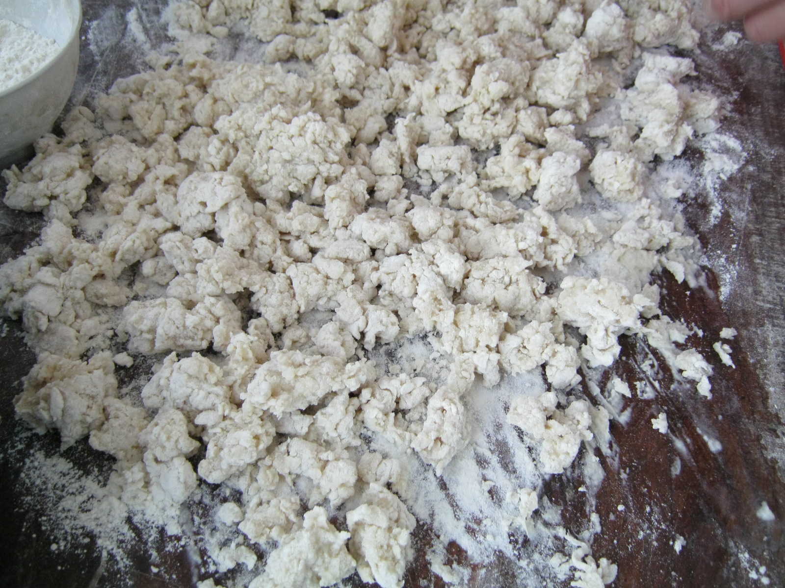 接下来,把揉好的面,揉成细长的圆柱形状,用刀切成一个个小小的圆柱体,用面杖擀成一个个小圆片,然后,把拌匀的鸡蛋韭菜馅儿放进去,用手包好。