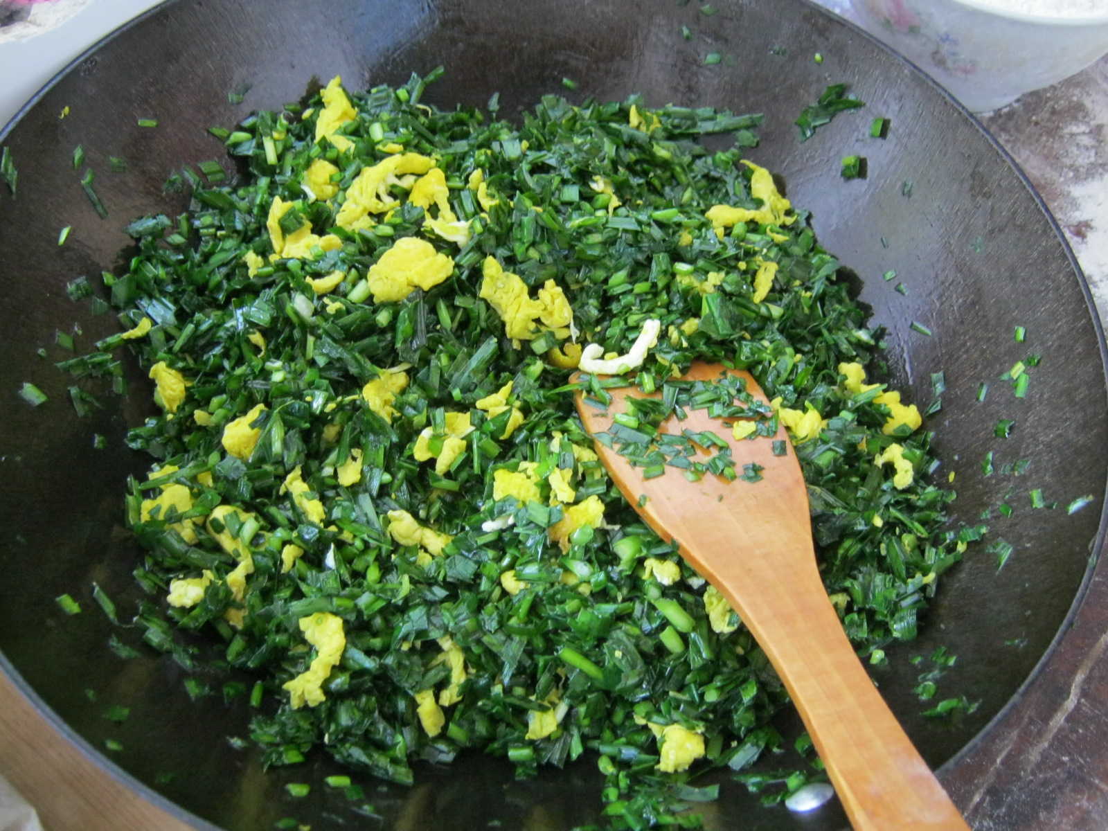 接下来,打几个鸡蛋,用筷子把鸡蛋搅散;把韭菜洗干净,切碎备用。再往锅里加油少许,等油滚了,把鸡蛋倒入油锅中炒一炒。炒好了,把切好的韭菜放入锅中,加适量的盐,搅拌。