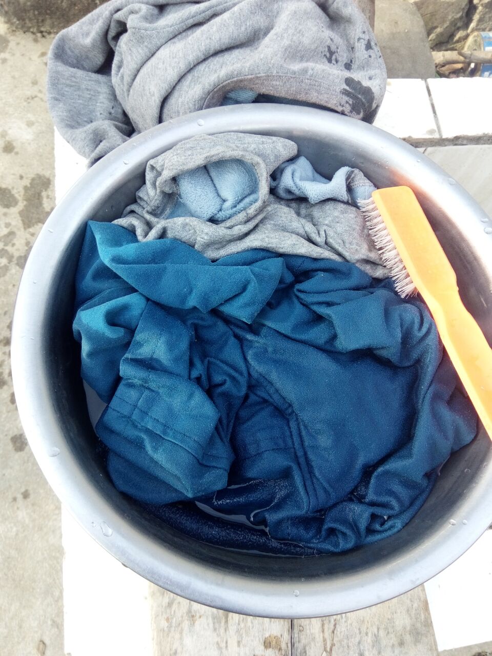 说干就干,我把那堆衣服放在了水盆里。由于现在是寒假,就算出了太阳也有点冷。于是我就倒了半盆热水,半盆冷水。拿到水井边开始洗,然后又拿了一把刷子,我先把那些衣服泡湿,然后把它摆在搓衣板上,左手按着衣服,右手拿着刷子,开始刷起来。我把衣服的每一面,大概都刷了一两分钟。然后心里想,脏东西应该都被刷下来了吧?结果把衣服拿上来一看,呀,什么都没了刷掉。