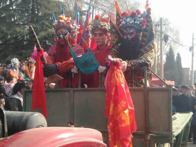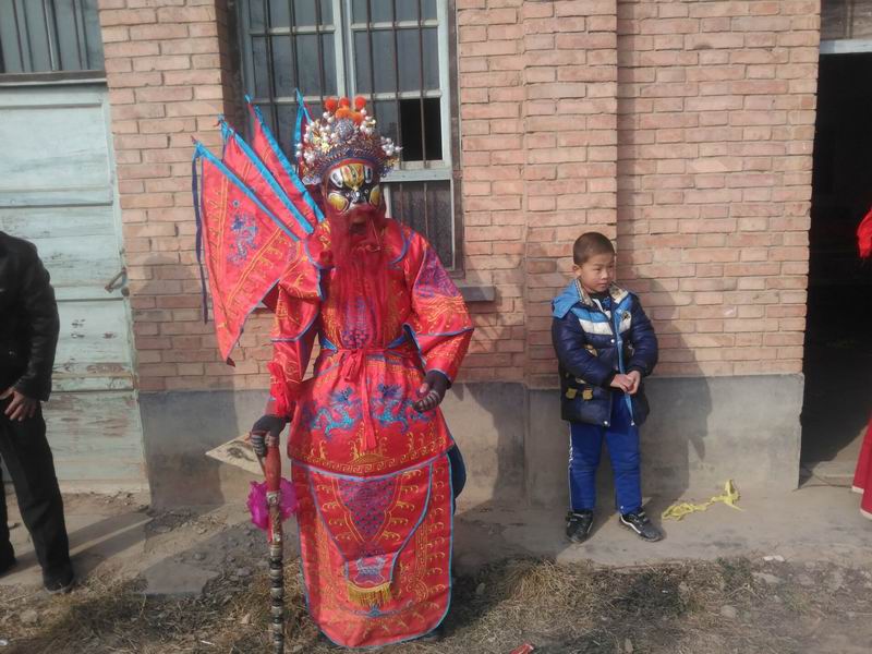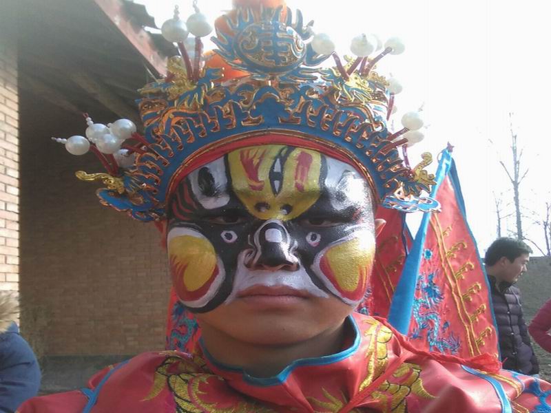 今天是正月初六,一年一度的迎神日。"迎神",顾名思义,迎接神明。这也是人们为了来年风调雨顺,家和万事兴的一种美好的祈愿。迎神过程极为复杂其中最主要的组成部分便是社火,可以说,社火贯穿了我们过年的每个部分。早晨六点,我们这些扮演社火的人员便早早的来到村委会,进行社火化妆。社火种类繁多,有地台社火,走社火,鬼社火,血社火,骂社火,马社火。而迎神,要用的便是马社火,因为现在交通工具发展了,各家各户都没有了马匹,所以便用拖拉机代替。我忍着严寒,化好妆,整装待发。我扮的社火名叫"崇黑虎",一般人们叫它"黑虎",是一种辟邪的神明,一般都被用作先锋开道,意为"神灵路过,小鬼闪开"。因此,我被安排在了第一辆车上,刚一上车,便有许多人找我合影,还有的人让我抱着他们的孩子照相,希望孩子和"黑虎"合照之后能平安成长。