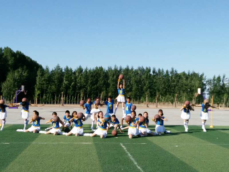 这是男女混合篮球花样体操,他们摆成一个“心”形,表示团结,奋进,也突出了阳光体育的主题。我运动,我快乐!