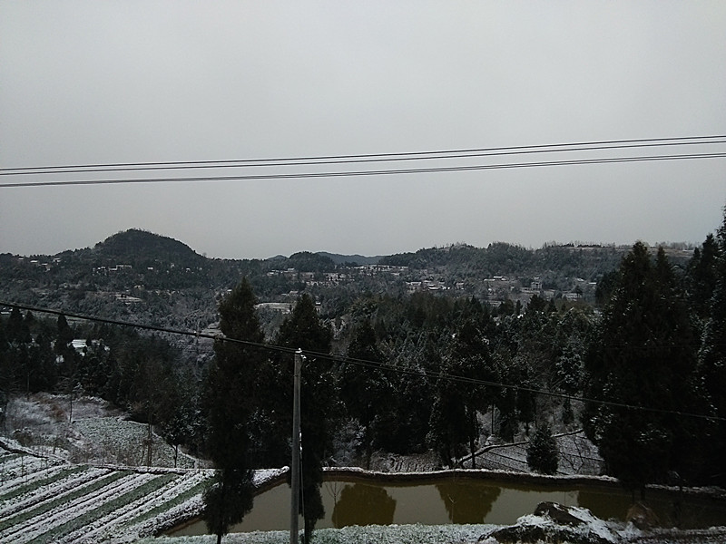 雪花还在天上飞舞,好似一只只精灵在嘻嘻一样,看得我愣愣出神,它的美丽就如同向天鹅的羽毛,而我只能膜拜它的美,不能用任何言语去亵渎它的纯洁与美丽。依稀可见对面山上还是有些雪的,可见它覆盖的面积还是很大的。