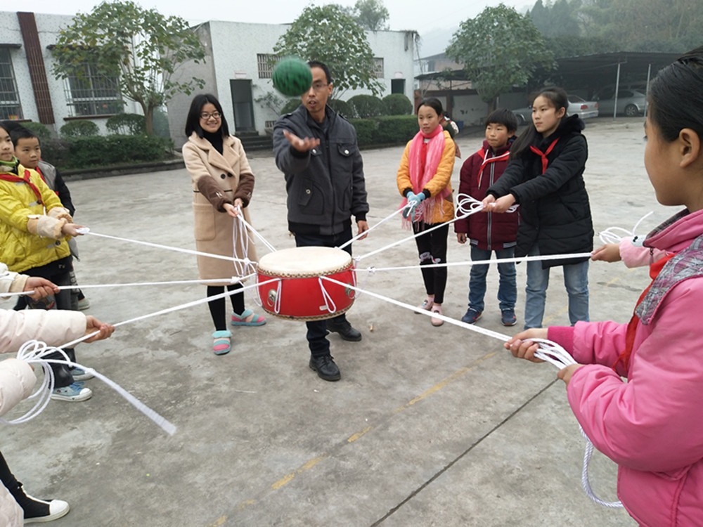 这同心鼓真好玩,你瞧一些老师也来玩了,他们正在接球了,拉着绳连同鼓来接球,一下接了十多个,不错哦!一个个玩得兴致勃勃,一批走了,又一批同学上来抢着玩。