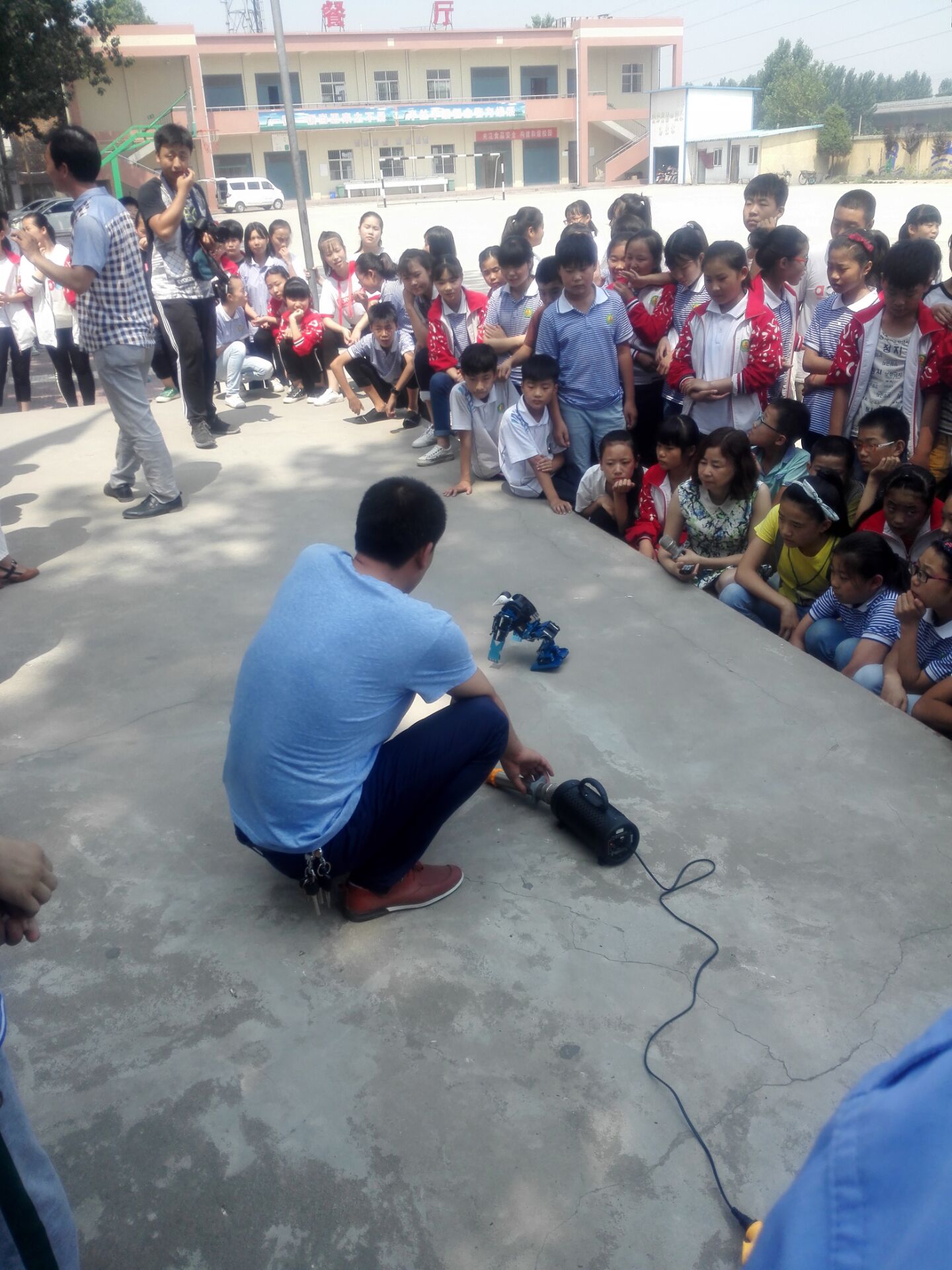 今天我们学校迎来了一队特殊的客人,华阴市科技局的工作人员。他们给我们带来了电视上才可以看到的机器人表演。