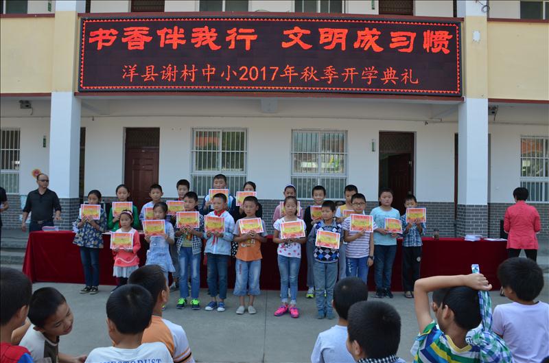 9月7日,谢村中小举行了以“书香伴我行,文明成习惯”的开学典礼活动。