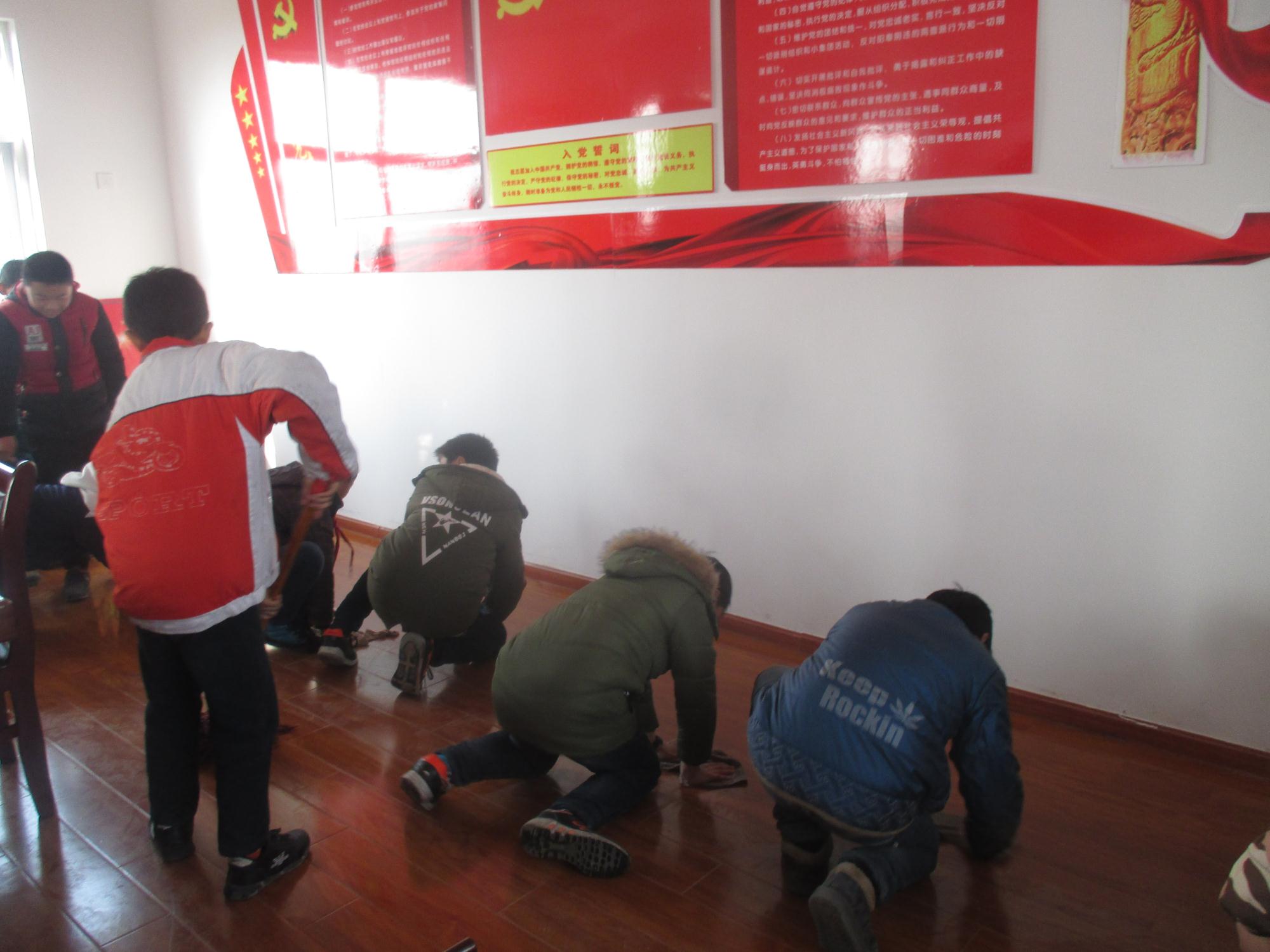 男生负责到楼下打水,楼上先是由我们女生出场。我们按着老师的指令,也分了几个小组,没几下子,我们把玻璃、桌椅、门窗都擦得干干净净。这时轮到男生上场了。他们的任务是用抹布把地板擦干净。只见他们排成一排,蹲在地板上,紧挨着向前擦去。