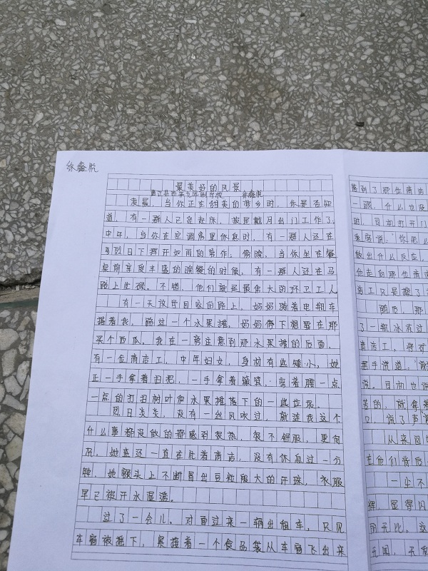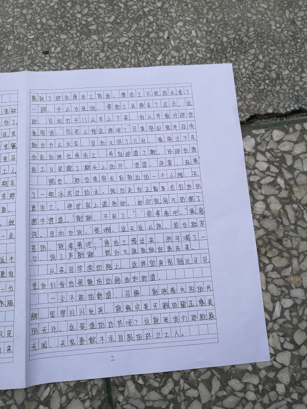 烈日炎炎,没有一丝风吹过,就连我这个什么事都没做的都感到很热,很不舒服,更何况,她还一直在忙着清洁,没有休息过一分钟,她额头上不断地冒出豆粒般大的汗珠,衣服早已被汗水湿透。