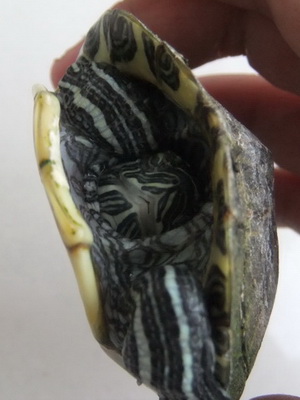 小乌龟的头特别小,身子显得较大。整个小乌龟只有我手心大小,坚硬的外壳上有一道道褐色的花纹,样子很可爱。