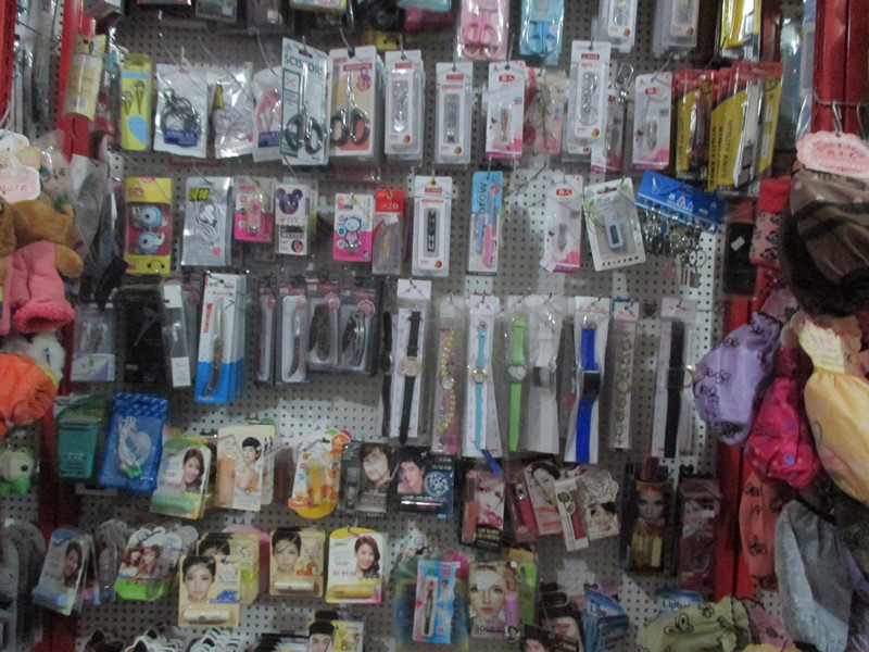 在左边和右边的中间,有一个架子,架子上摆着各色各样的小玩意儿,像小说、漫画、拼图、双面胶、胶水啊什么的。