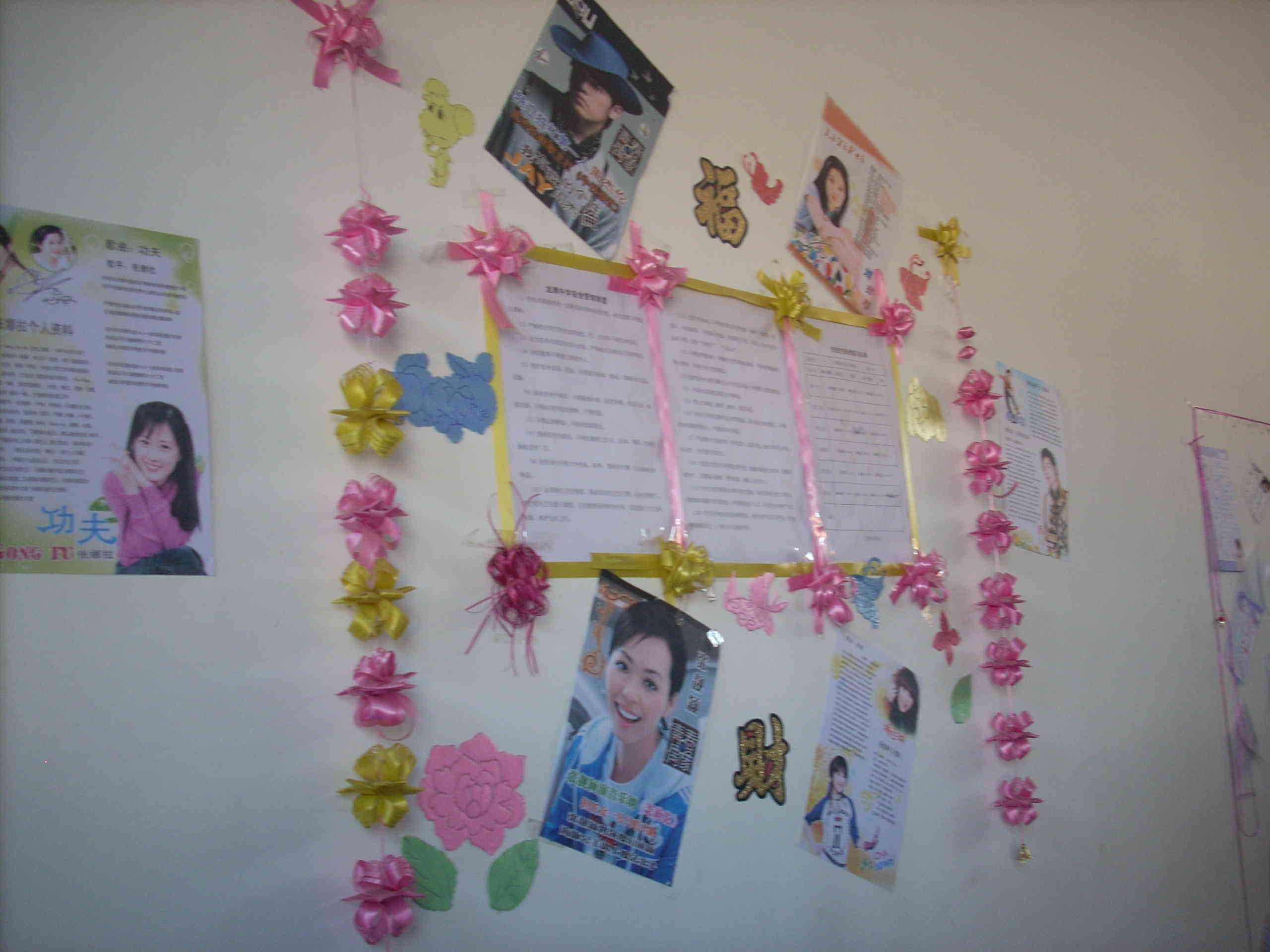 在宿舍是最美的应该是那些墙壁了。这样说是不是有点奇怪,墙壁怎么能是最美的呢?不要急!来看看吧!在墙壁上面,有着我们精心设计和制作的各种作品。有我们喜欢的明星照片,有我们自己动手做的装饰品,有我们写的文章。这一切,都给我们宿舍增添了无限的情趣。