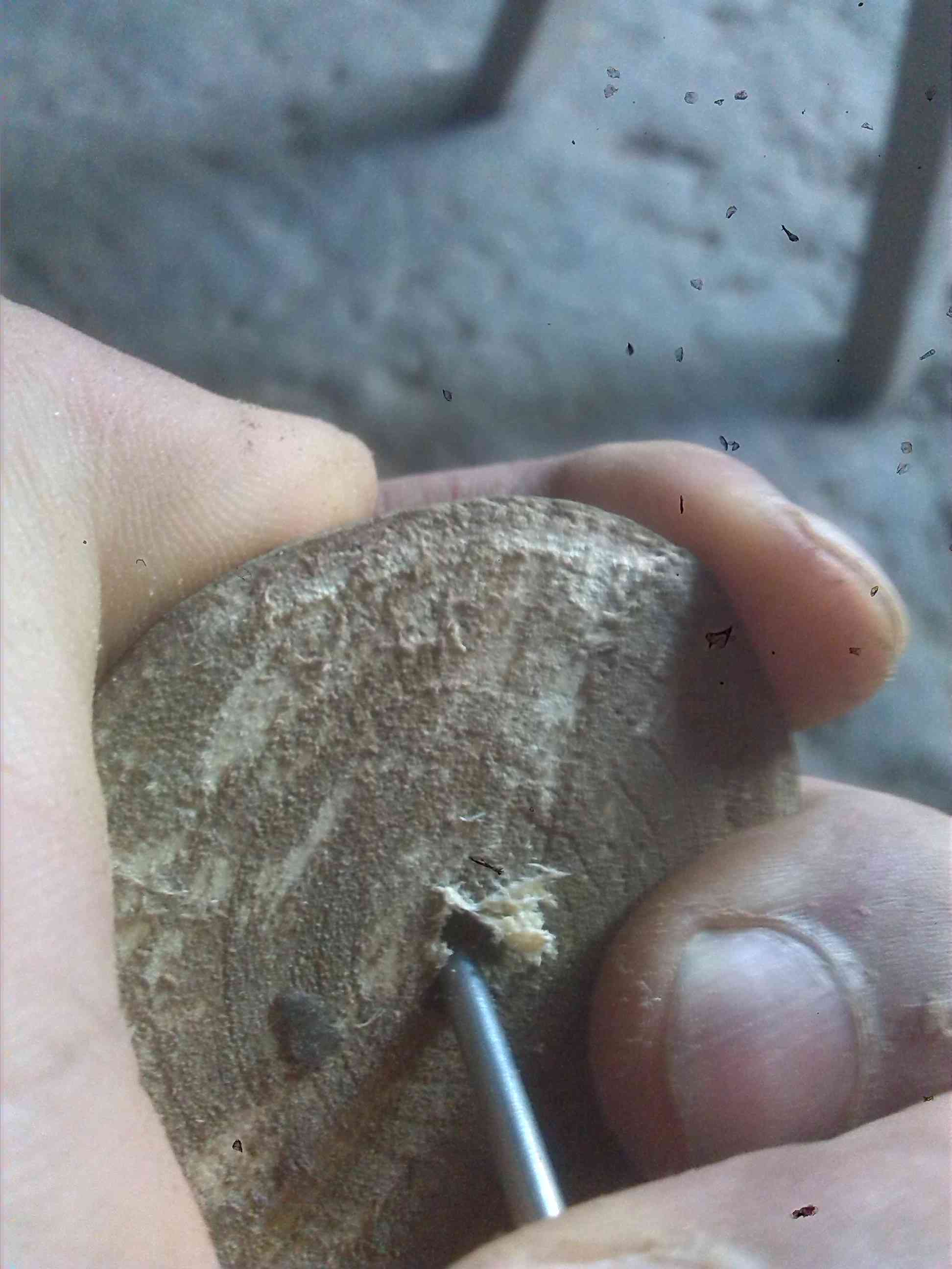 然后,我又在大木块的中间钉了一颗钉子,接着又用工具给拔了出来,之后再钉进去又拔出来,这样反反复复进行了不知多少次,而木块中间也出现了一个较大的洞,当然,能在钉子上自由地转动了。接下来,我又拿出一截空管,这是在用完了的中性笔上剪的。将它给套在钉子上并且保证也能在上面自由转动后,我才将它们一块给钉在了木块的边缘。还得小心锤打,因为钉得太死了就没法转动了嘛。