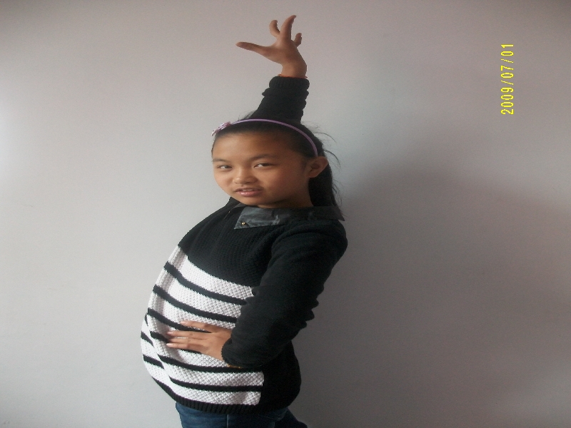 "她"是一个活泼的女孩,大大的眼睛一眨一眨的;短短的头发天生一个"假小子";红红的嘴巴能说会道;灵巧的耳朵能听见很多事情。"她"是一个多才多艺的女孩,静的、动的都没落下:书法、珠心算、拉丁舞、绘画、吉他。很多学校的活动,你都会看到"她"的身影。"她"也是老师的好帮手,在学校中担任班长的职务,老师很多事情需要"她"的帮助。