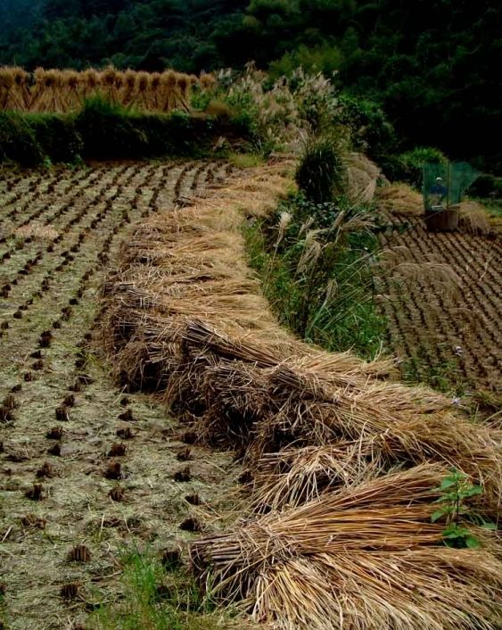 在农村收割水稻一般是用镰刀,收割水稻时一般都要穿长衣长裤,为了是防止被水稻的叶子割口子,如果不慎被它划破了,一会再出点汗水,这其中的滋味可想而知。将水稻的颗粒与秆分开就要用一种称为“拌桶”的工具,人们拿起一小捆水稻,用力地将它摔打在一个类似桶状的木制器具上,由于惯性的原因,水稻就与秆分开了。想像一下两三千斤的水稻就是用这种方法生产出来的,不知要摔动胳膊多少下。