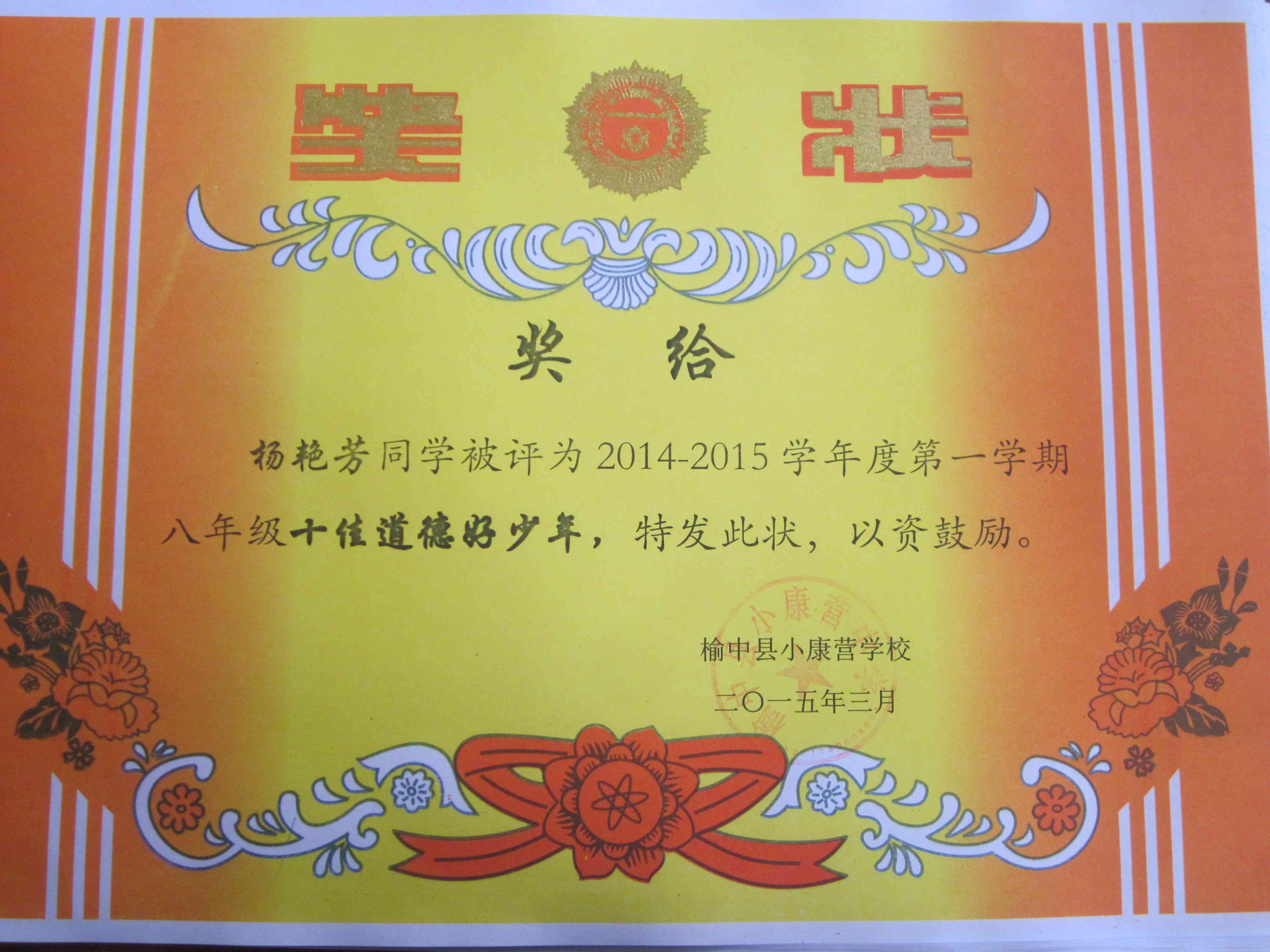 我班杨艳芳同学获得了"十佳道德好少年 "的称号,她获奖了,我们都为她感到骄傲,希望她继续努力、继续加油!
