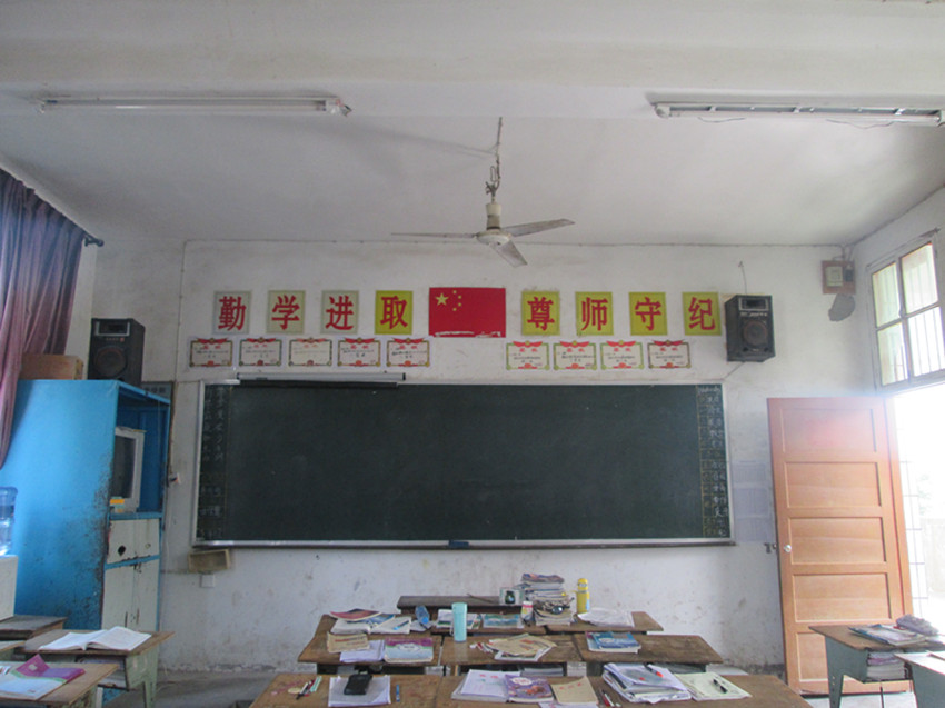 教室前粘贴这样几个大字"勤学进取,尊师守纪",它是勉励同学们在这样好的环境下要好好学习、将来好回报新中国。