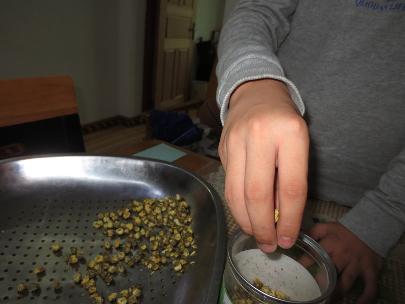 采完菊花,我们赶紧把刚采摘的菊花做成菊花茶,先把采摘来的鲜菊花蒸熟,要旺火,铁锅中放水先煮沸,菊花放在蒸笼中隔水蒸熟,大约五分钟左右。蒸熟后我们把菊花均匀的放进筲箕,放太阳下晒直到完全脱水,大约需要15日。