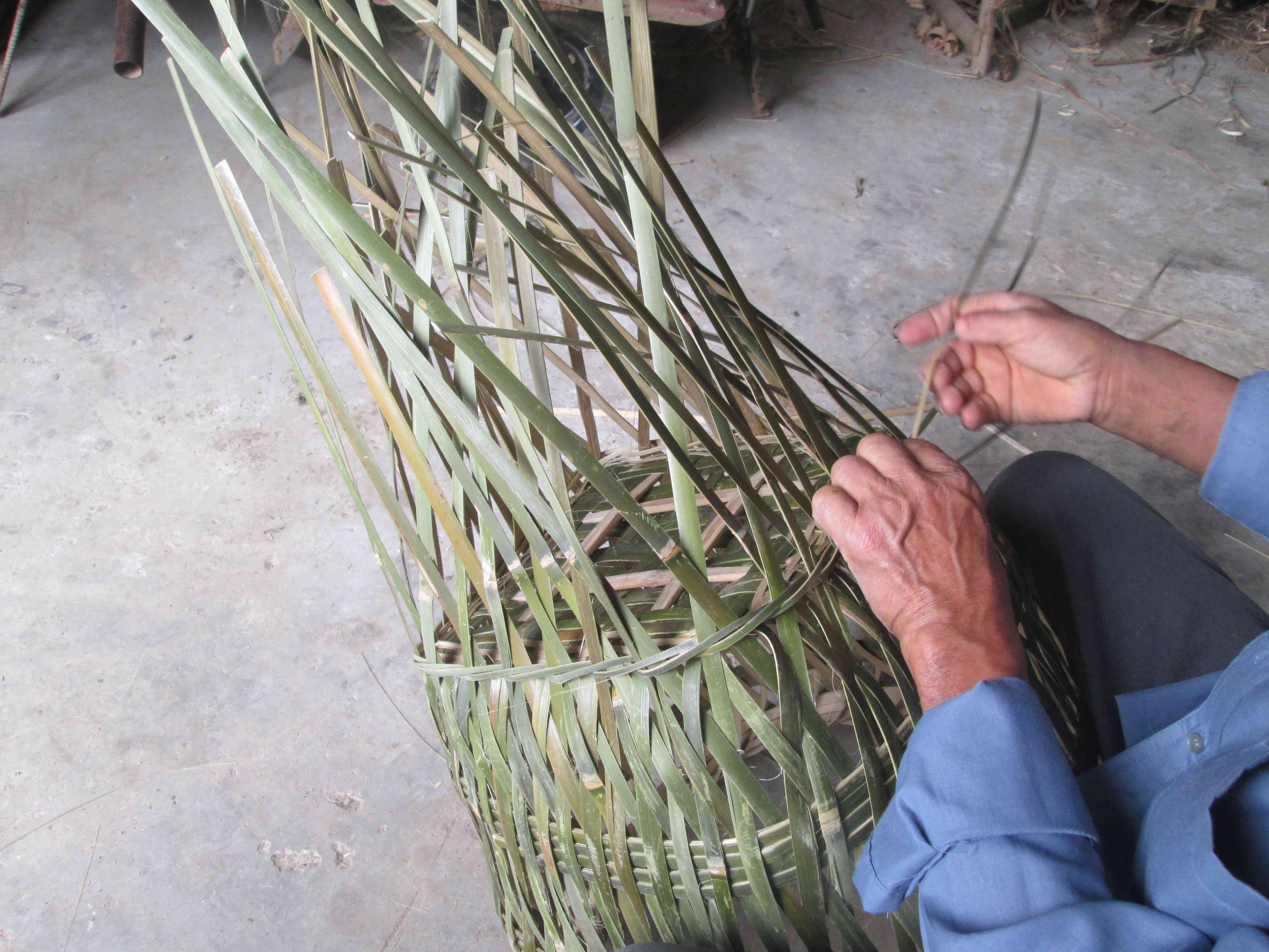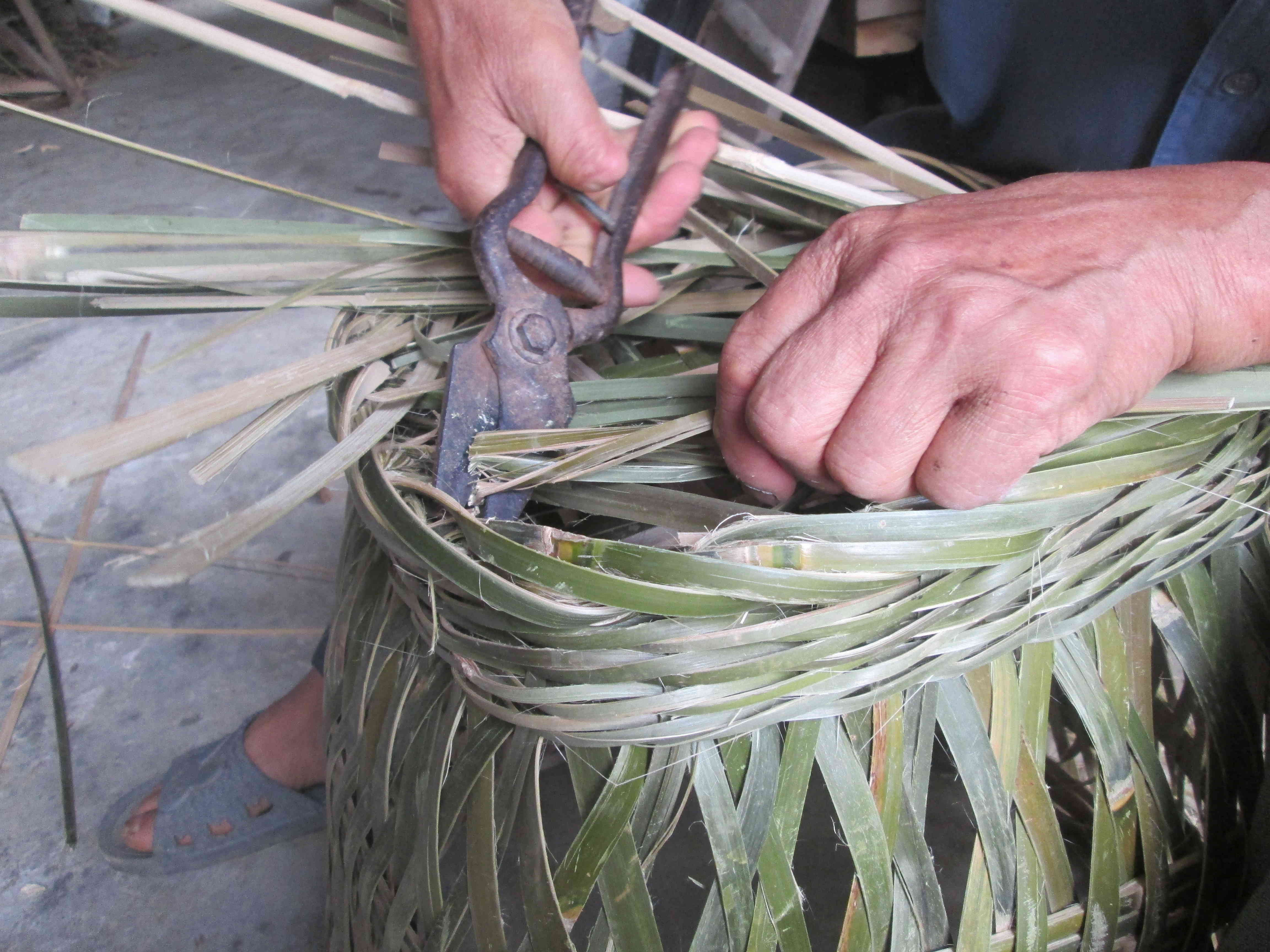 编苕篼篼是一项手艺活,所以必须要细致,中间只要有一点点小错误就会影响整个苕篼篼的美观和实用程度,所以中间容不得一丁点的马虎。我爷爷编苕篼篼已经很多年了,手法自然已经很娴熟。爷爷说:要想把苕篼篼编好,开头的根基打好是关键,如果根基没打好,后面再怎样修改也是枉然,苕篼篼永远都会是歪的。编苕篼篼先从上面往上编,编过四条箍篾后就又往下倒,往下倒的时候一定要注意,一个篾孔只能插一次篾,也不能不插。倒到最后的时候就要开始编篼底了,这时就要用一条更细的箍篾了,一条编完了之后就要把多余的篾条揪进去,再用剪刀剪掉,这样一个苕篼篼就编好了。