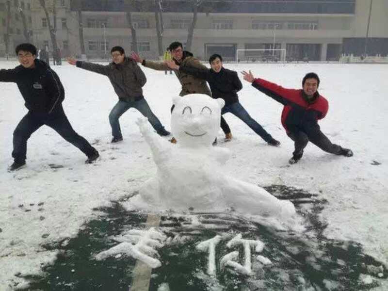这是今年冬季的第一场大雪。看,我们的校园都是白白的一片,外面的世界真白,老师们也行动起来了;看,这是我们学校的年轻老师们,他们帅吧!五位男老师,堆了一个雪人,写上字“走你”,摆了一个“辽宁号”起航的造型,好酷吧。