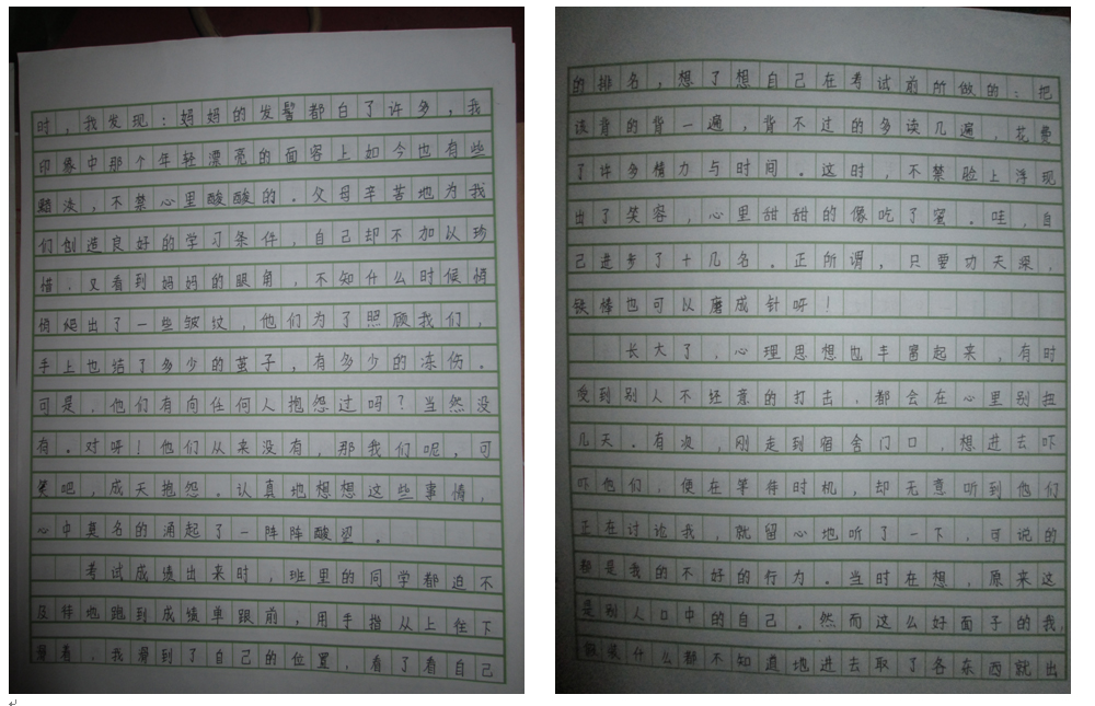 初中了,我们在学校里玩耍打闹,心思不在学习上,总抱怨着学习很累,很枯燥,每天都睡不够。可曾想过在地里干农活的父母,他们省吃俭用,不辞辛劳,为的是让我们好好读书。回到家,坐在舒适的沙发上,看见了正在打扫卫生的妈妈,这时,我发现:妈妈的发髻都百了许多,我印象中那个年轻漂亮的面容上如今也有些暗淡,不禁心里酸酸的。父母辛苦地为我们创造良好的学习条件,自己却不加以珍惜,又看到妈妈的眼角,不知什么时候悄悄爬出了一些皱纹,他们为了照顾我们,手上也结了许多茧子,有许多的冻伤。可是,他们有向任何人抱怨过吗?当然没有。对呀!他们从来没有,那我们呢,可笑吧,成天抱怨。认真的想想这些事情,心中莫名的涌起了一阵阵酸涩。