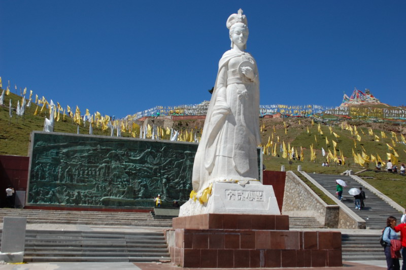 如今是文成公主白玉雕像。多么动人心魄的传说,为了国家的太平、人民的幸福,她远嫁西藏,这既现青春又献身的壮举,值得后人的怀念和敬仰,也正是这种壮举,使她的名字永留人间。这是我中华的民族精神、民族灵魂,值得歌颂,值得赞扬。