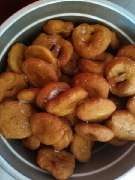 随着时间一分一秒的过去,盆子里的面团越来越小,锅里炸好的油饼也越来越多了,最后撒上一把白砂糖,金黄的色泽变得更加诱人!咬一下酥脆美味,嚼一嚼唇齿留香,简直是不可多得的人间美味啊!