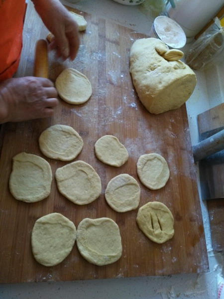 首先,姥姥往盆子里舀了好多白面和较少的黑面,然后往里面放入了牛奶和鸡蛋,这样是为了让面更劲道也更香。然后,姥姥就用她饱经风霜、布满皱纹的手揉起了面,那些雪白的小精灵被这双有力的大手揉在了一起,聚成了一个巨大的淡黄色面团,看着就十分诱人。