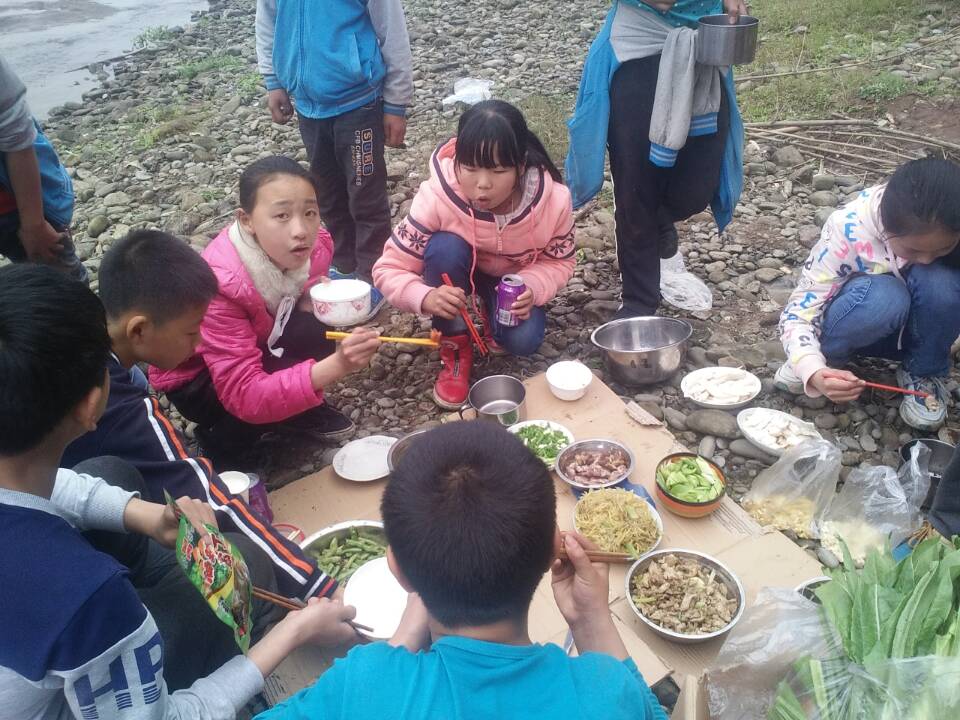 选完了食材当然要和大部队会合,开始属于我们的“二万五千里长征”。山上的景色真是漂亮。过了一会儿,就到了我们的目的地——小河边。到了,我们快步走到小河边,开始打灶,当然了这些活自然是归男生管咯,还有拾柴、切菜。