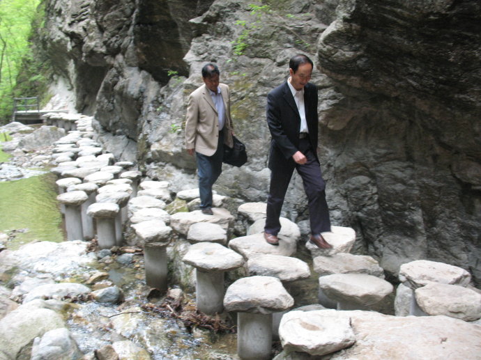 清澈的泉水就这样踏着轻快的步伐,从山顶奔跑到山脚下。山涧中的婉转是泉水在半空中掀起的狂澜,它大笑着,阳光下它尽情的绽放着,最终在山脚形成一汪碧潭。这怎就不是"山光悦鸟性,潭影空人心“呢?蘑菇石林也是其中的一大特色。山脚下,一个个形状酷似蘑菇的石头铺成一条细长的情趣小道,蜿蜒曲折,穿过山脚碧潭与溪流,与嶙峋怪石擦肩而过,到达彼岸。