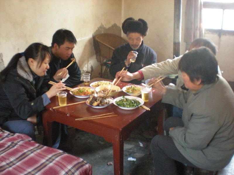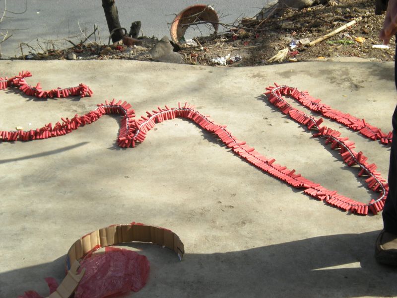 这些琐碎的杂事忙活完之后,就快到中午了。这时,大人们就已经快把饭菜准备好了。但是,在吃饭之前,还需放一挂鞭炮,预示着吉祥。传说“年”是一种为人们带来坏运气的想象中的动物。“年”一来,树木凋敝,百草不生,“年”一“过”,万物生长,鲜花遍地。过“年”需用鞭炮轰,于是有了燃鞭炮的习俗。