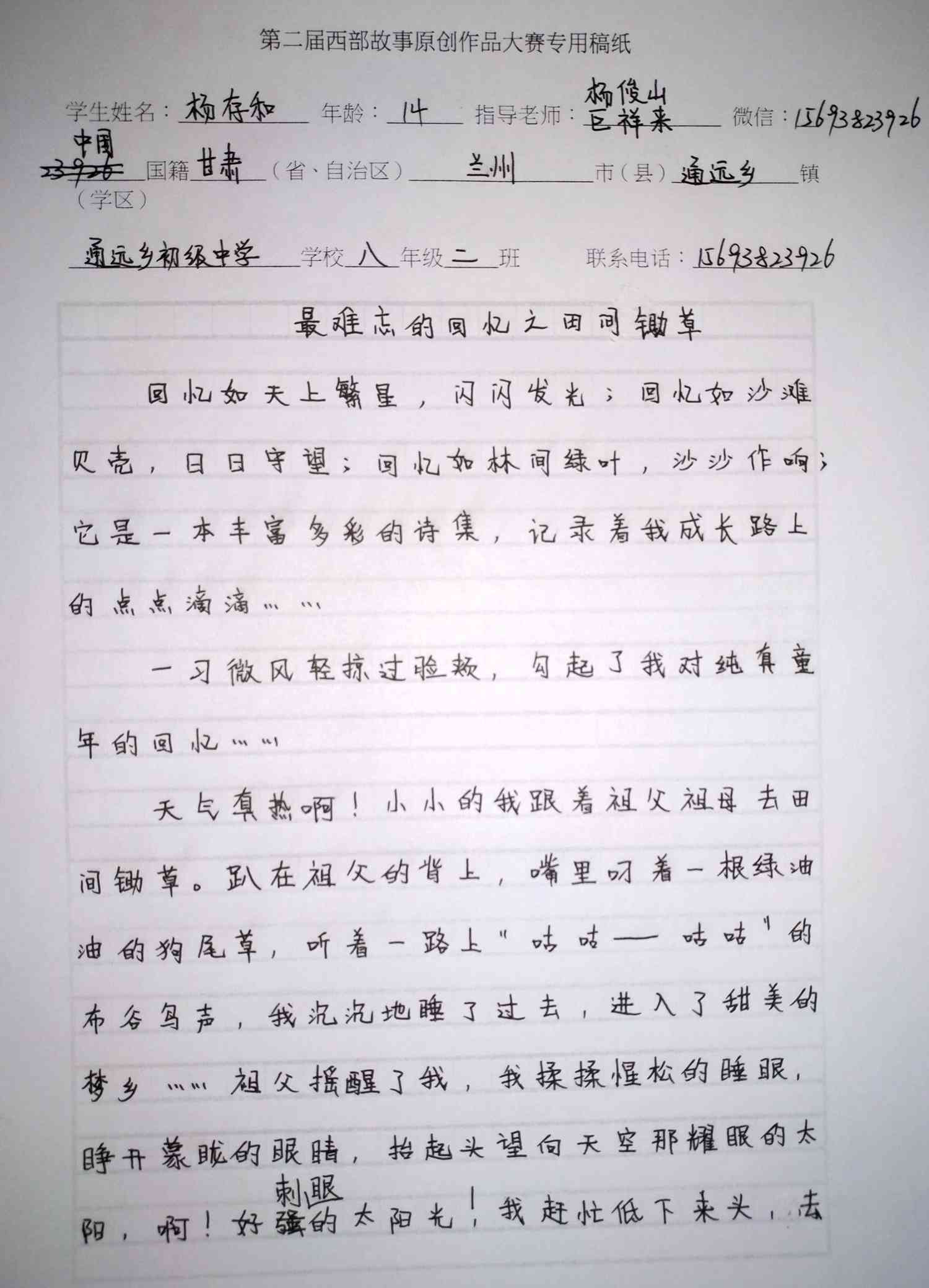 祖父在地东侧,祖母在地西侧。我在祖母旁边问东问西。“奶奶,我们为啥要来地里?”“来锄草呀。”祖母擦了擦头上的汗,弓着身子继续锄草。我又问道:“奶奶,为什么我们要顶着这么热的炎阳来锄草呢?”“如果不趁早把杂草锄净,麦苗的养分就会被杂草给吸收了,就像如果不把你带走,你就会把弟弟的饼干偷吃了一样,哈哈……”祖母说完大笑起来,而我的脸上却多了一圈红晕,我不好意思地低下了头。可是不一会儿,我又开始向祖母问长问短:“奶奶,您来地里的路上为啥扛着锄头而不背我?”“你这傻丫头,你爷爷背着你呢,所以我就不用背你了啊。”祖母慈祥的话语中略带不耐烦的语气,她转过身不再理睬我。于是我离开祖母,向地东侧的祖父兴冲冲地跑去。