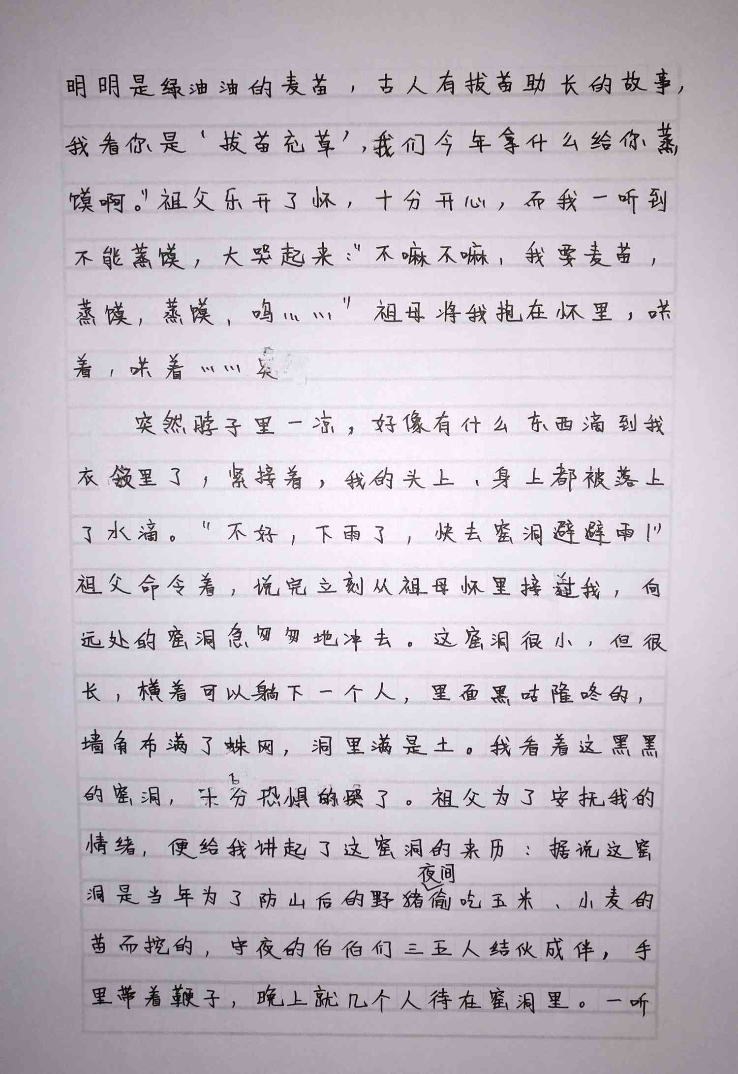 突然脖子里一凉,好像有什么东西滴到我衣领里了,紧接着,我的头上、身上都被落上了水滴。“不好,下雨了,快去窑洞避避雨!”祖父命令着,说完立刻从祖母怀里接过我,向远处的窑洞急匆匆地跑去。这窑洞很小,但很长,横着可以躺下一个人,里面黑咕隆咚的,墙角布满了蛛网,洞里满是土。我看着这黑黑的窑洞,十分恐惧的哭了。祖父为了安慰我的情绪,便给我讲起了这窑洞的来历:据说这窑洞是为了防山后的野猪夜间偷吃玉米、小麦的苗而挖的,守夜的伯伯们三五人结伙成伴,手里拿着鞭子,晚上就几个人待在窑洞里。一听见野猪的叫声,就从洞里出来,拿鞭子在地上使劲敲,鞭鞘与地面撞击发出的巨大响声吓走了野猪。祖父讲的故事十分传神,我听得入了迷……望着洞外的山峦,轮廓已经模糊得看不清了,渐渐地,雨停了。我顺着蜿蜒的山路跟着祖父祖母回家了。