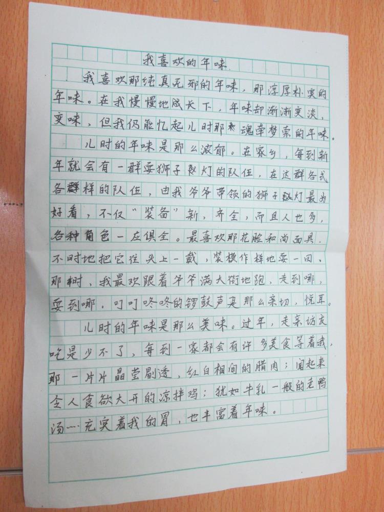 儿时的年味是那么浓郁。在家乡,每到新年就会有一群耍狮子灯的队伍,在这群各式各样的队伍中,由我爷爷带领的狮子灯最为好看。不仅"装备"新,齐全,而且人也多,各种角色一应俱全。最喜欢那花脸和尚的面具,不时地把它往头上一戴,装模作样地耍一回。那时,我最喜欢跟着爷爷满大街地跑,走到哪儿,耍到哪儿,叮叮咚咚的锣鼓声是那么亲切,悦耳……儿时的年味是那么美味。过年,走亲访友,吃是少不了的,每到一家都会有许多美食等着我。那一片片晶莹剔透,红白相间的腊肉;闻起来令人食欲大开的凉拌鸡;犹如牛乳一般的老鸭汤……充实着我的胃,也丰富着年味。