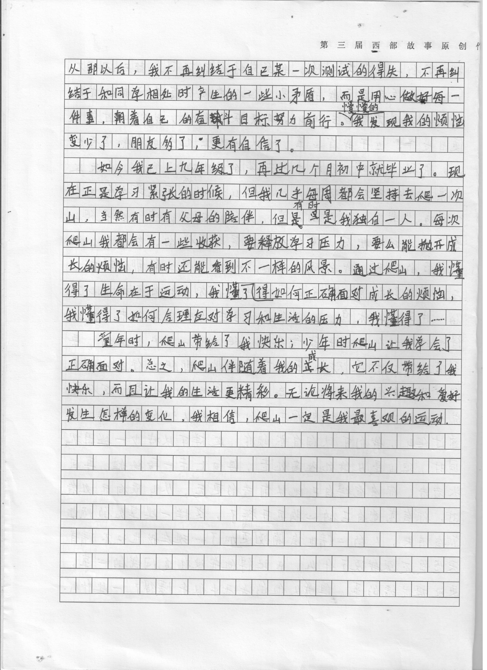 童年时,爬山带给了我快乐;少年时,爬山让我学会了正确面对。总之,爬山伴随着我的成长,它不仅带给了我欢乐,而且让我的生活更精彩。无论将来我的兴趣和爱好发生怎样的变化,我相信,爬山一定是我最喜欢的运动。