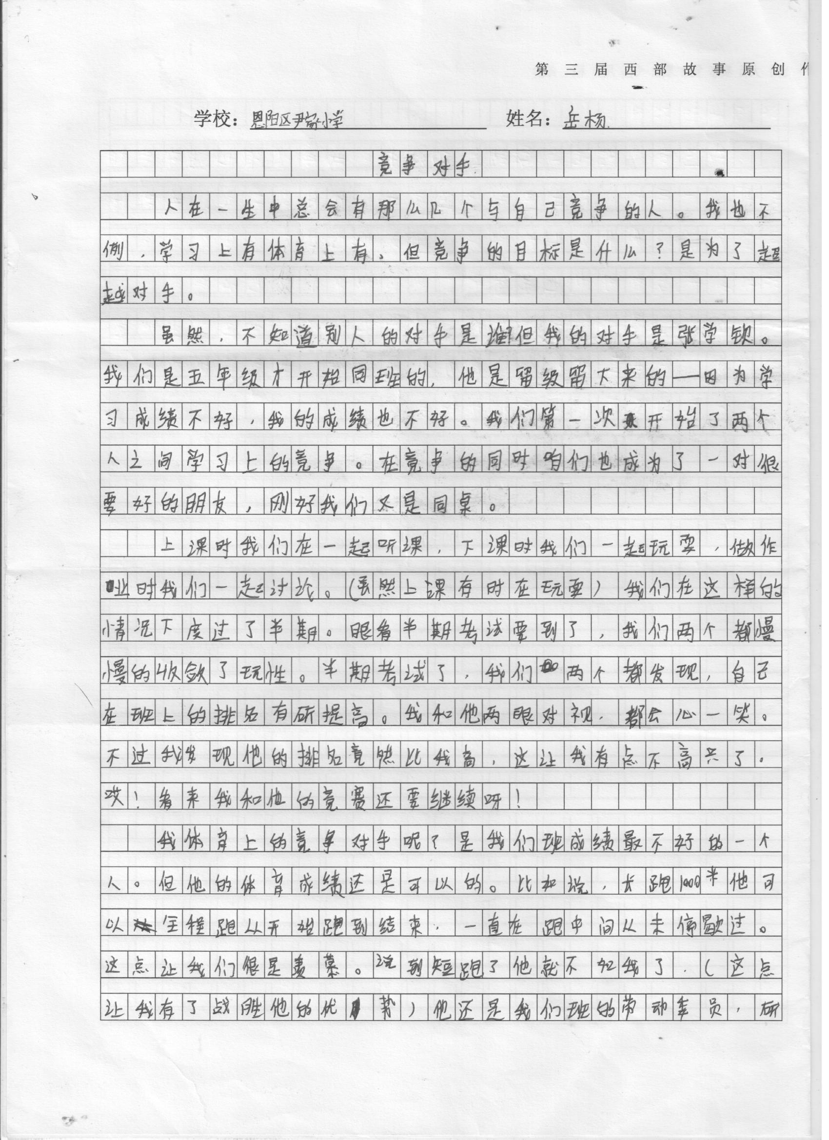 虽然,不知道别人的对手是谁?但我的对手是张学钦。我们是五年级才开始同班的,他是留级留下来的一一因为成绩不好,我的成绩也,不好。我们第一次开始了两个人之间的,学习之间的竟争。在竟争的同时咱们也成为了一对很好的朋友刚好我们有是同桌。