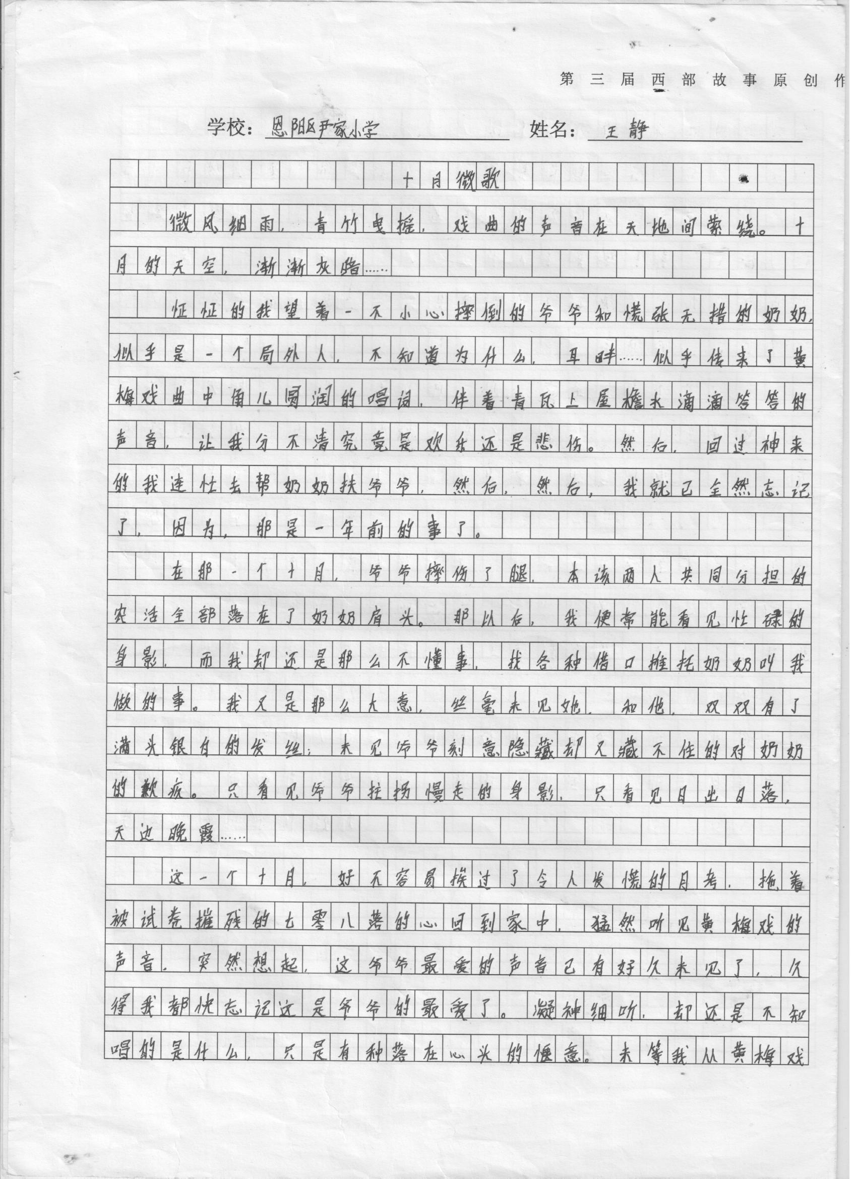 怔怔的我望着一不小心摔倒的爷爷和慌张无措的奶奶,似乎是一个局外人,不知道为什么。耳畔……似乎传来了黄梅戏曲中终角儿圆润的唱腔。伴着青瓦上屋檐水滴滴嗒嗒的声音,让我分不清究竟是欢乐还是悲伤。然后,回过神来的我连忙去帮奶奶扶爷爷。然后,然后,我就已全然忘记了。因为,那是一年前的事了。
