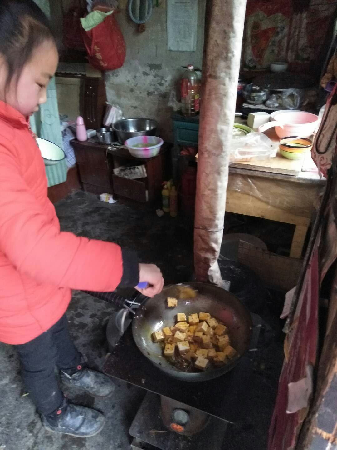 我打开电磁灶把炒锅放上去,当炒锅烧热后,我就倒了些油,等油开始冒热气时,妈妈就让我放一袋烧豆腐的调料,我怕油溅到身上,不敢往锅里放,妈妈就让我关上火,等油温稍微低点时再放进去,等调料炒一阵后,妈妈就让我把豆腐放进锅里,但是我还是不敢,妈妈就让我把豆腐从锅边放进去,果然从边上倒进去以后,油就没有溅到我身上。只听"嗤啦"一声,豆腐和油好像发生了矛盾似地吵了起来——油溅了出来,就连锅里的豆腐也炸开了,妈妈怕油溅到我手上,就让我拿铲子把豆腐翻个身,我接过铲子去翻,可是怎么也翻不过来!妈妈手把手地教我翻,一边翻豆腐,一边说:"你翻的时候把铲子横过来一点就能铲到了。"