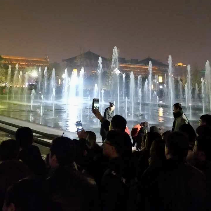 们因为错过大慈恩寺的开放时间,无缘登塔俯视市容,只能抬头仰望这座“塔势如涌出,孤高耸天宫”的古塔。很想进去观摩的我们无法亲自登塔,只能用目光去欣赏。其实,弯月陪伴的古塔别有一番滋味。走累了,坐在地上看看游人穿梭来回,也是一种特别的感受。九点整,喷泉正式开始。可惜看的人太多了,我们无法清晰地欣赏音乐中的喷泉样式多变,水柱形态各异。先是一段朗诵,随后便是场面浩大的喷泉表演了。