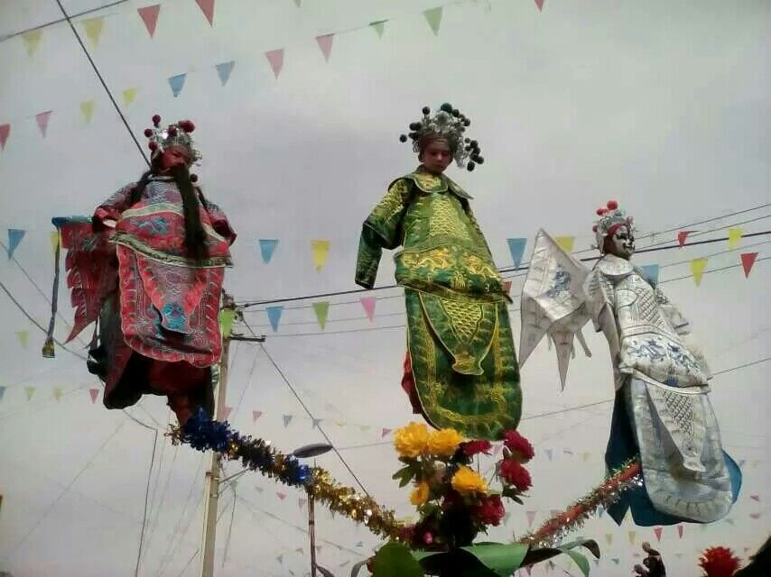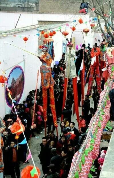 踩高跷的来了,来者都是大登殿的穿着漂亮的戏服,高高的高跷有三米的、二米的、四米、五米、一米的,二米的,高跷都可以跳,大多数踩一米,二米的高跷的都是中学生,三米的高跷一直走着有时转个圈,四米五米的高跷就只负责走路,旁边得有家人撑着撵子,防止摔倒、摔伤,踩高跷的人们都穿着漂亮的戏服,有什么关羽、刘备,诸葛亮等等这些人物。